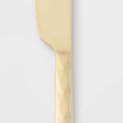 Impress your guests with the opulent look of this 20-Piece Stainless Steel Cherryfield Silverware Set from Threshold™. This gold-tone silverware set comes with service for four, including four each of dinner forks, salad forks, knives, dinner spoons and teaspoons, to meet all your serving needs for family gatherings or hosting a dinner party. These stainless steel utensils have a textured design and bright hue that will add visual interest to any table setting.
