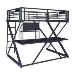 Truly extraordinary sleep, study, and storage. A complete youth bedroom in the space of a full-size bed. This versatile loft bunk includes a full-size upper bunk and a study desk unit underneath. The desk work surface is set up to handle computers or video games, the pull-out keyboard tray will fit any of today’s keyboard technology, and the suspended storage shelf complete the features. Made of heavy gauge powder coated tubular steel end frames in the unique z-bedroom shape, brushed chrome trim and machined aluminum decorative caps, and black hi-pressure laminated work surface give this study loft the rugged construction to survive in any youth environment. Some assembly required; Mattress not included.