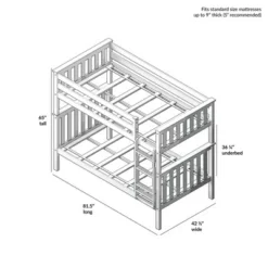 - Total Footprint: Bunk bed measures 81.5”L X 42.5”W X 65”H; Versatile design allows bunks to easily be separated into two free-standing beds